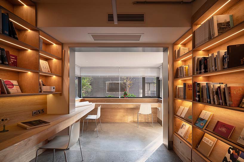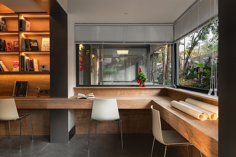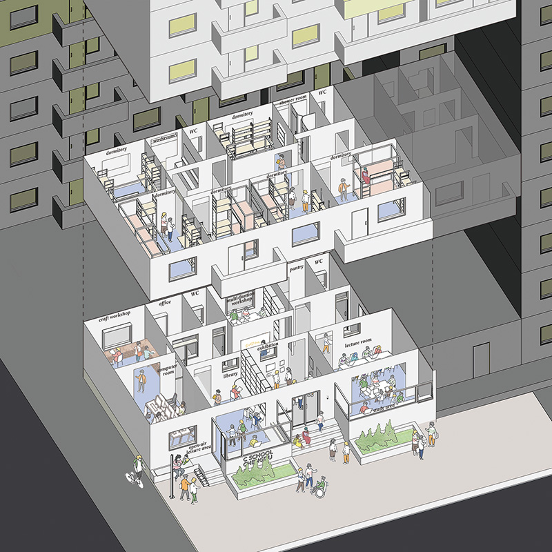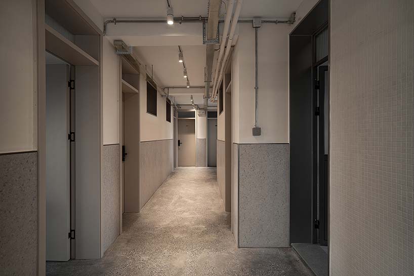 The original building, once a factory dormitory, was partially renovated and expanded. The ground floor now serves as a school communal space for teaching, workshops, exhibitions, and a library. Except for fixed shelves, all furniture is modular and can be rearranged for various uses. The design retains traces of time—old terrazzo floors and high corridor windows were restored to bring new life. The formerly dim apartments were opened up at the balcony side, extending toward the street. Glass above eye level allows natural light while maintaining a sense of security for students studying by the windows.