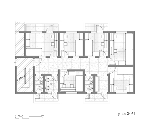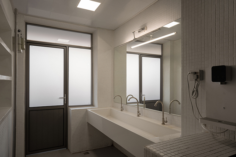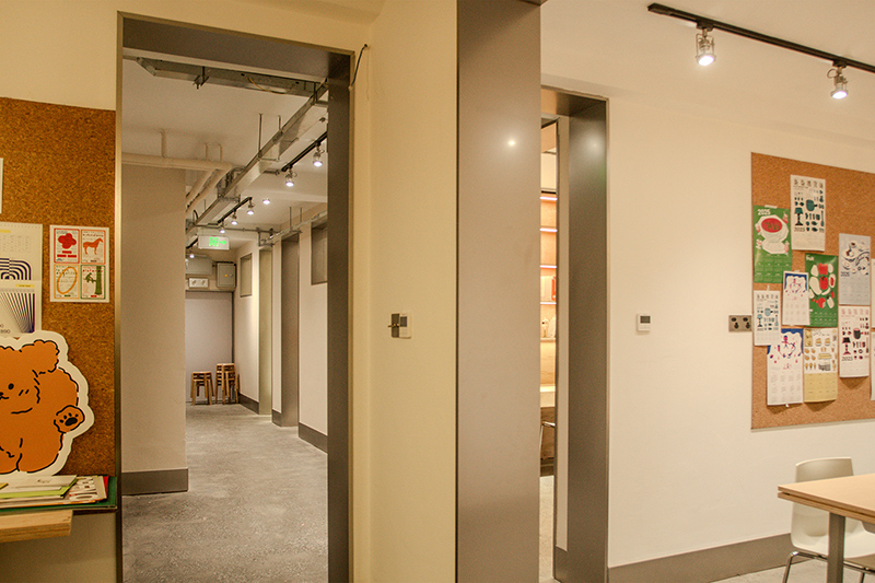 The second to sixth floors of the old building were converted into dormitories. They are fitted with modular furniture, including wardrobes with adjustable shelves, desk-storage units, and bunk beds with privacy panels. This flexible setup allows the space to be easily adapted into a youth hostel during holidays or to host short-term artist residencies.